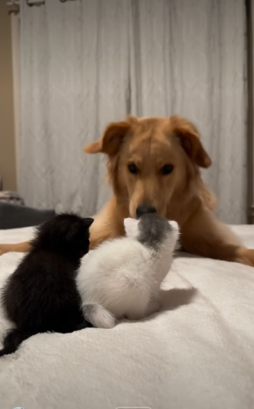 In a now-viral moment, a Golden Retriever named Clara comes face-to-face with her new foster kitten siblings… and completely loses her composure. Not out of fear. Not out of confusion.