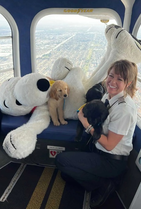 A group of adorable puppies, who are just beginning their rigorous service dog training, received a spectacular, sky-high send-off aboard the Goodyear Blimp, joined by the world’s most famous beagle, Snoopy.