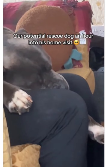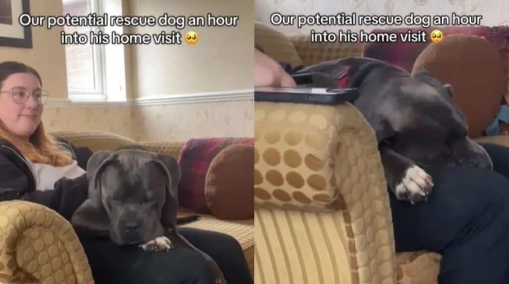 The footage shows him leaning in, settling against her, and then dozing off — trust fully anchored. For a dog with an uncertain past, that level of comfort is nothing short of astonishing.