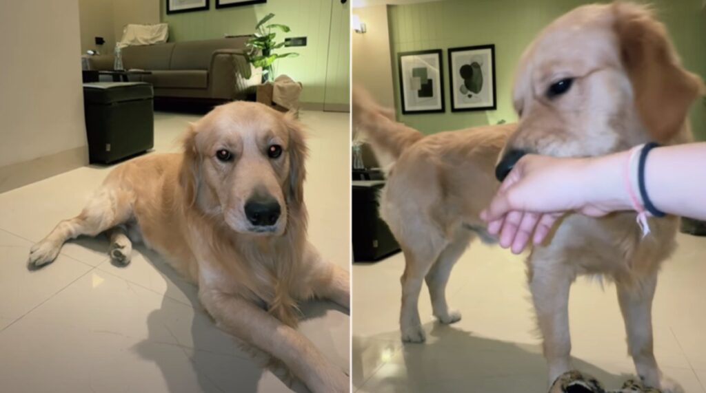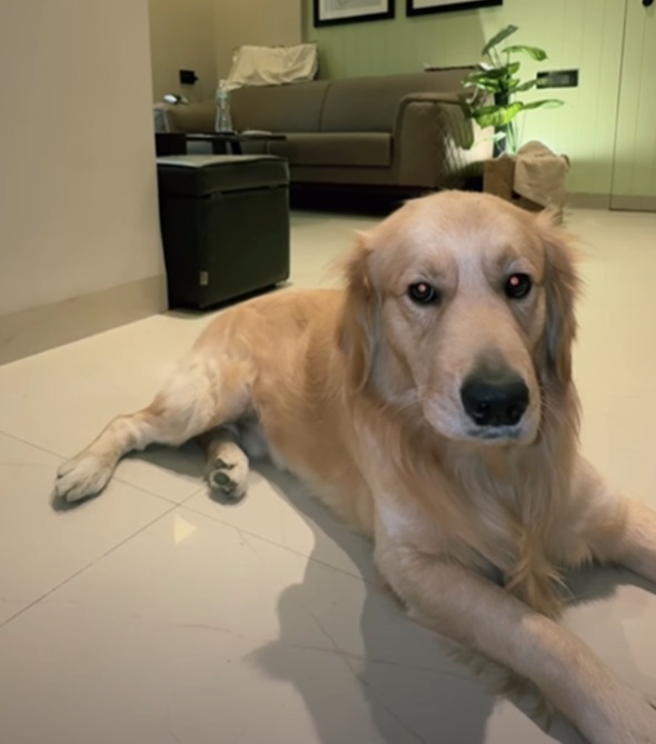 The video — shared by Instagram user @miimiisgram — begins with the Golden lounging calmly on the floor, looking relaxed and peaceful.