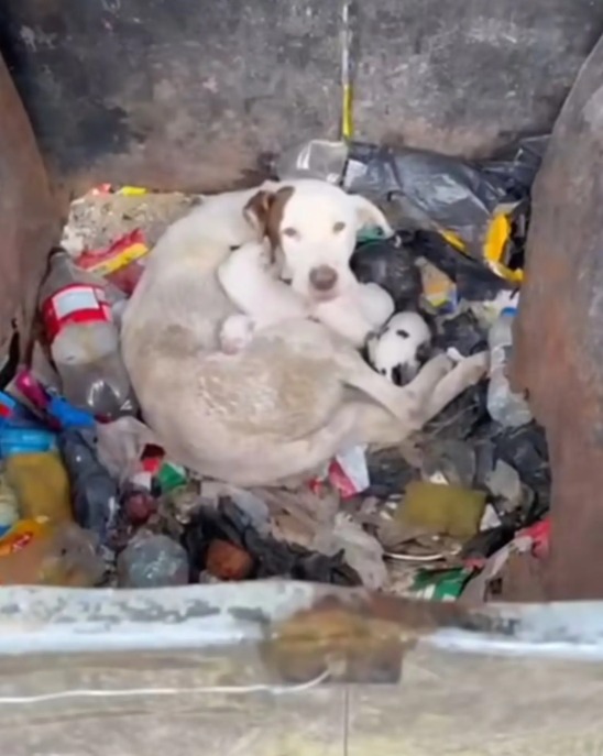 But when one woman lifted the heavy lid of a dumpster on a freezing morning, she didn’t expect to come face-to-face with a small, shivering family staring back at her — a terrified mama dog and her puppies, cold, hungry, and desperate for help.