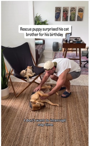 Meet Cactus, a rescue puppy with enthusiasm cranked up to eleven, who decided to pull off the most earnest surprise for his cat brother, Miso.