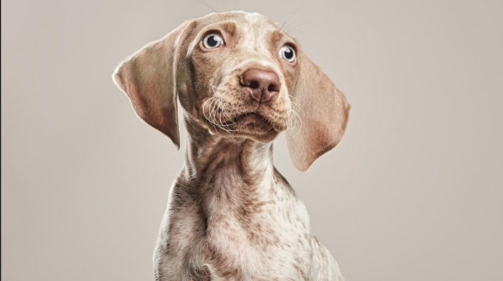 His head tilts to one side, ears perk up, and his wide eyes reflect a mix of confusion and fascination. It’s the kind of reaction only a dog experiencing something new can give — a raw, instinctive response that’s equal parts adorable and thought‑provoking.