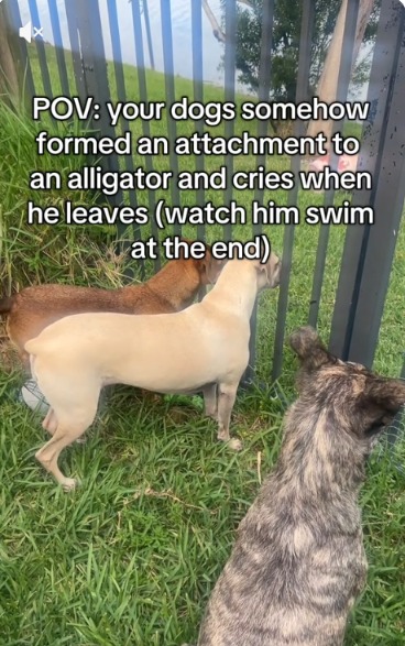 Sometimes the most beautiful friendships happen in the strangest places — like behind a metal fence, where a group of rescue dogs stands, mesmerized by an alligator gliding through the water just a few feet away.